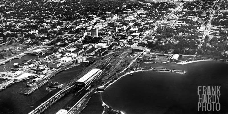I ran across this aerial a year or so back, but never wanted to spend the time to clean it up. It is an interesting view of the Port of Pensacola because it is shot from the east looking back to the west. Most of the aerial views that I have posted before always seemed to be looking north up Palafox or from the west looking back to the east. You even have a decent view of Seville Square, even though it looks to be all trees and not much of a park. I have no date for this image, but I would say early 1950’s. Anyone know a date, please speak out …
