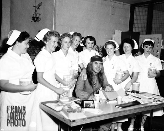 Thanks for the comment … I do not know who any of the nurses are int the photo or for what purpose that he was at the old Sacred Heart Hospital for. It looks as if he was there for some type of fund raiser because of all of the containers that the nurses are holding in the photo. If you can find out anything about the photo, please let us know … Frank