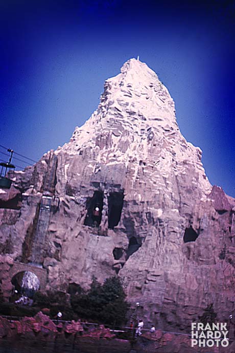 This is ” Matterhorn Mountain ” in Disneyland and this photo was taken sometime around 1962 or so. Disneyland in California is the only park that has this ride. According to the Disneyland web site, it started out as a hill, but Walt Disney turned it into a 147 foot tall mountain thrill ride, after seeing the original Matterhorn while making a movie there in 1957. The site says that this ride contains the first tubular steel roller coaster ride in the world. There are photos of the mountain on the web site and it still looks today as it did when this photo was made. I have been scanning a good number of negatives and slides that I have run across cleaning up recently, so I will have a lot to post in the next few months. Thanks for looking and please check back … Frank
