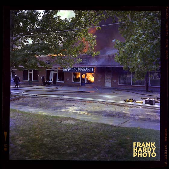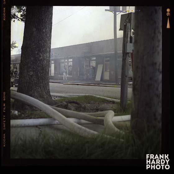 On Sunday August 17, 1975, a fire destroyed this entire block. It was a Sunday morning around 11:00 when it started in the freezer of Exotic Florist. There was an electrical short in the wiring of the freezer that held Exotic’s flowers. This building was built sometime in the early 1950’s and the building code did not require fire walls between the offices … since there was no fire wall, all of the units shared a common attic. Once the fire got into the attic, it was just a short time until all of the businesses where consumed in fire. My father happened to be there at the time and was able to grab a few cameras and save them, but everything else in his studio was completely destroyed. The following is a photographic story of the fire, the aftermath and the rebuilding of the block. There are a lot of photos and they really need no explanation, so I won’t bother you with any …