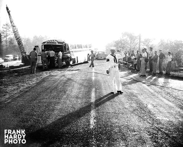 All of these photos you have been looking east. Since this is an MP directing traffic, my guess that the vehicle that ran into the bus might have contained military personnel. Whiting Field is no where near this bridge, so the MP would have no reason to be in the area unless he was just driving by and wanted to help. In the middle photo you see where they are connecting the tow truck to bus and if you look real close in the first photo, you see the tow truck on it’s back two wheels with it’s front wheels completely suspended three or four feet off of the ground. They must not have had these huge commercial tow trucks that you see towing 18 wheelers down the interstate back in the 1950’s. Another photo …