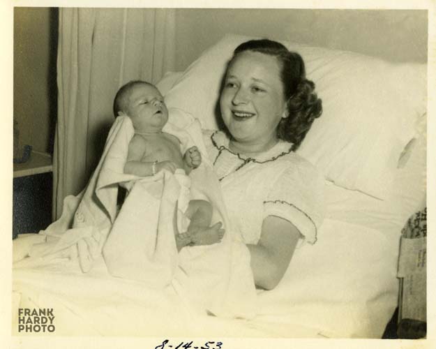Now, looking at this photo, you get the impression that they were in my mother’s room standing around talking and enjoying themselves. Well, back then, there was no such thing as a ” private ” room ,,, you were in a ward with other mother’s and their babies. The next photo shows after everyone had left …