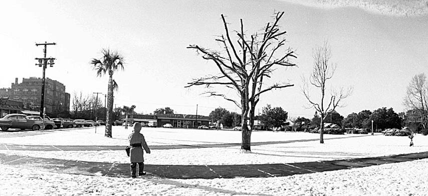 I decided to post a few more of these snow scenes from back in February 1957 to show how much snow Pensacola received …Now on 1/29/14 we have an ice storm and everything comes to a stand-still. The Interstate is shut down and almost all of the bridges in the surrounding counties have been closed, so essentially you cannot travel anywhere between Escambia and Santa Rosa Counties. The photo above is a scan from a transparency of the park on 12th Avenue and Gonzalez Street in East Hill. I have posted other views of this park that my father had made from this time in earlier posts, but I do not believe that I have posted this exact one before. You can see the old Winn-Dixie grocery store at the other side of Gonzalez Street. On the far left side, you see a corner of the old Sacred Heart Hospital … I have recently run across a photo that my father had taken of a group of nurses standing outside in the snow that I have not posted yet, but could not find the folder I placed it in. I will spend a little time looking for it this afternoon later, it is a cute photo of a group of nurses having fun in the snow. Here is one more new snow scene …