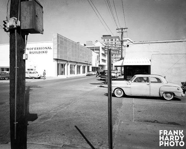 This is the corner of Baylen and Government Streets in 1960. In today’s Pensacola News Journal Sunday Edition ( 3 Nov 13 ) the attorney firm that occupies the corner where George’s Grill is located had an ad celebrating their 25 years in business. The ad had a nice photo showing the exterior of their office building. I remember that I had seen this negative years ago and tracked it down and posted it to show how times have changed. This view was made 53 years ago and none of these building are no longer there. The Professional Building was torn down years ago to make way for the new Escambia County Annex building and garage. Next to the Professional Building was Mayes Printing and Office Equipment, which moved out to Car City in the 1980’s ( ? ) , not sure of the date. I do not remember George’s Grill, but I remember Mayes and the Professional Building. Thanks for looking … Frank