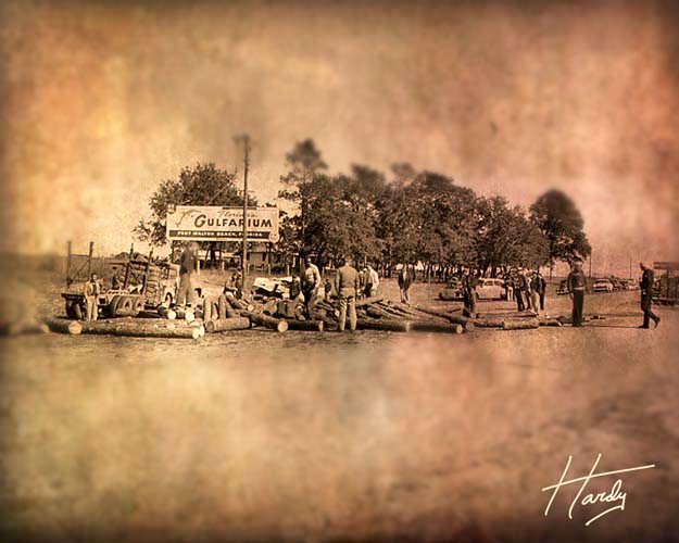 This is an image that is in bad shape and I did not feel like taking the time to work it up, so I just through a texture screen on it and ran it though several filters to give it this look. The sign of the Gulfarium is what really stands out in this image. I would estimate the date to be early 1950’s and I do not know where the location of the accident is. Below is the same image without some of the filters, but with the texture screen to clean up a lot of the negative damage. I like the color over-lay, toned images have always been a favorite of mine. Here is the “straight” image …
