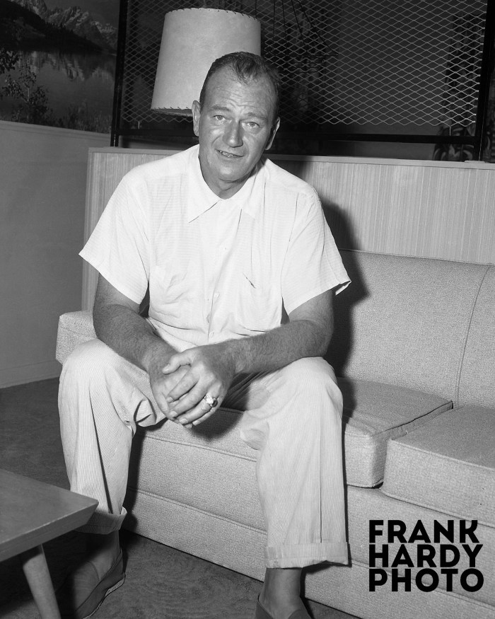 Here is a photo of John Wayne that my father made back in 1955 or 56, I am not sure exactly of the year. Duke was here in Pensacola making the movie, The Wings of Eagles , a John Ford film about a Navy aviator. He was staying at the Town House Motor Lodge and Mrs. Head, the owner, asked him if she had a photographer come over would he mind having his photo made for her ” celebrity ” wall. Fine with him, he told her. So my father went over and met Mrs. Head and Duke outside of his room. Mrs. Head introduced my father and Duke said that he remembered him from the airport taking photos when he got off of the plane. Mrs. Head then said that he was there to take his photo for her wall. To which Duke replied, ” I told you that I would send you a real nice photo when I got back to Hollywood. ” He then looked at my dad, put his arm around him and said, ” You know, that sounds as if I do not think that you can take a good photograph? ” . My dad said he just stood there, not knowing how to respond to the number one movie star in America at the time. Duke then said, ” Well, come on in my room and Frank you can take anything you like … just tell me where to sit and what you want me to do. ” My dad said that he could not have been nicer and said that he would send him a couple of photos and autugraph any photo that my father made. I have scanned the photos that he sent and I will post them next … I cannot remember if I posted the autographed photo that he made, along with the one of hime getting off the plane, so I will go back and check.